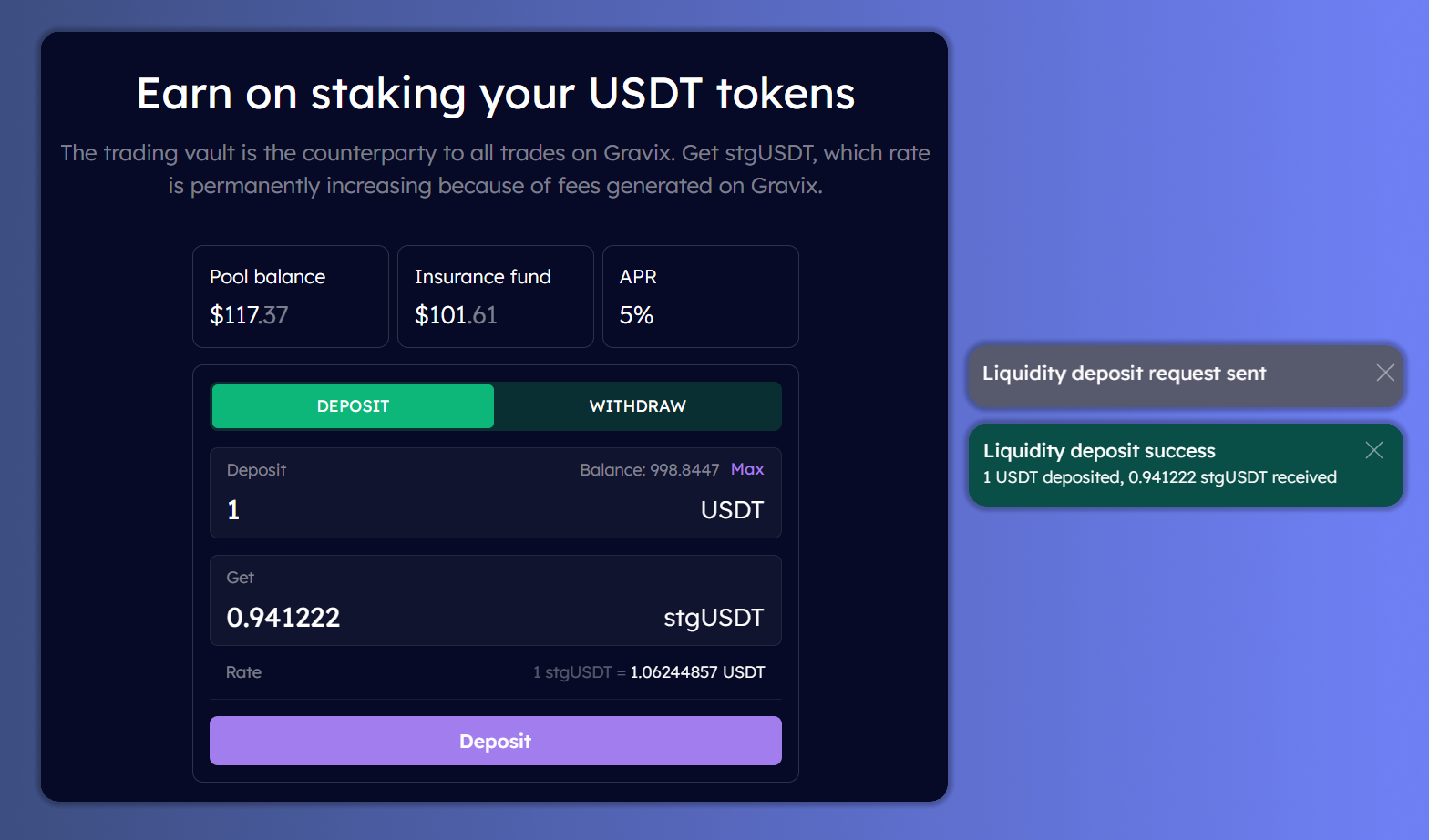Connect WalletEnter the amount of USDT that you want to deposit. Pay attention to the amount of stgUSDT you will get in return for your deposit